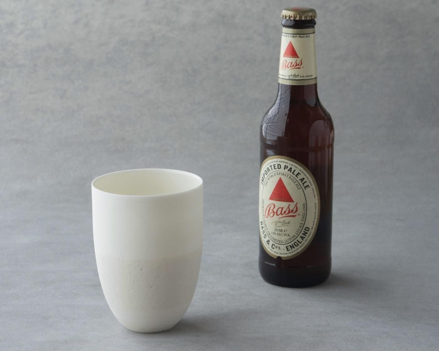 素材の白い信楽透器は、ざらりとした心地よい土の手触りと口当たりの良さが魅力。ガラス成分を含んだ透ける土は、月の光や灯りにかざしグラスが光りに透ける感覚もお愉しみいただけます。